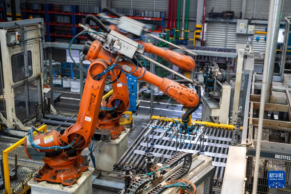 7月16日,在位于重庆市两江新区的重庆至信实业集团有限公司,机械手臂在热压车间内作业。