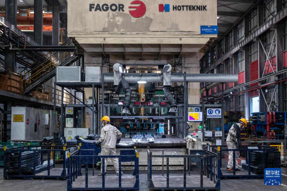 7月16日,在位于重庆市两江新区的重庆至信实业集团有限公司热压车间,工作人员等待搬运下线零件。