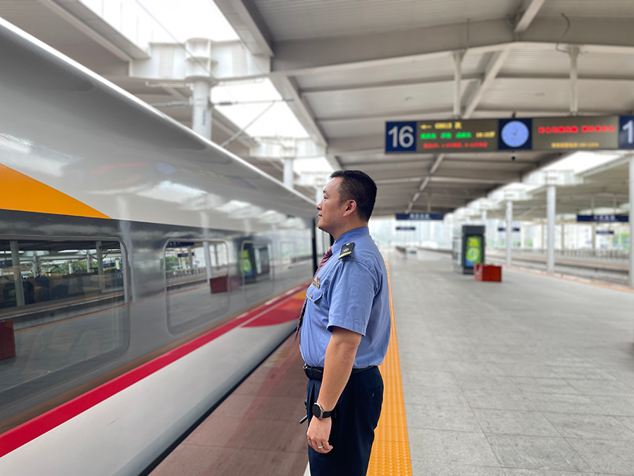 重庆北站客运值班站长赵伟杰在站台完成列车接发。孙婧宇 摄