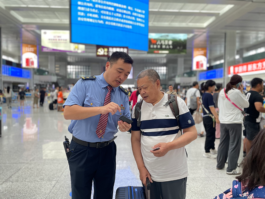 重庆北站客运值班站长赵伟杰在候车厅帮助旅客。孙婧宇 摄