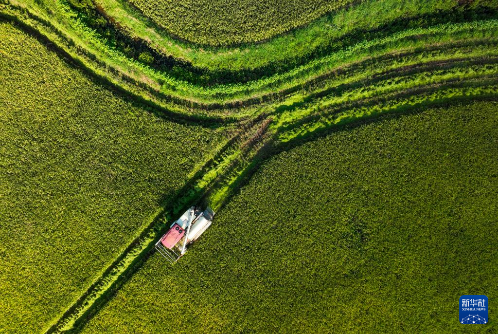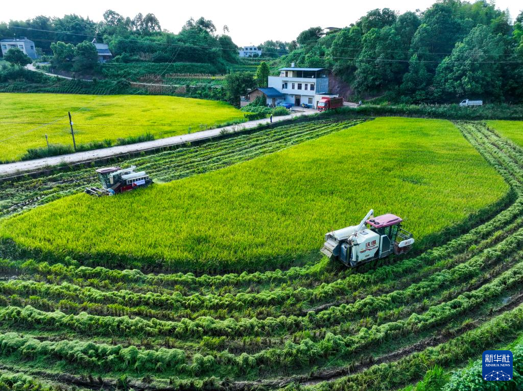 8月13日在永川区吉安镇金门村拍摄的水稻机械化收割作业现场(无人机照片)。新华社记者 王全超 摄