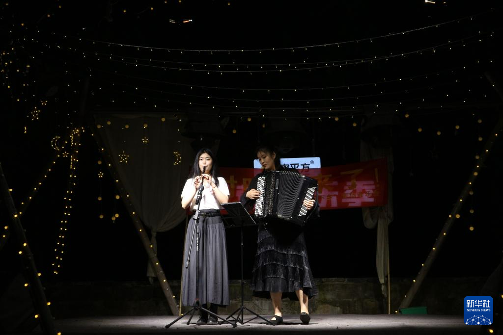 夜幕降临,实践队为中益乡的村民们带来了一场特色夏日“村晚”。国家级非遗土家啰儿调代表曲目《太阳出来喜洋洋》、歌舞朗诵《山村的夜晚》等节目精彩不断,盛大的篝火仪式和传统土家族摆手舞让乡村热闹起来。队员们将自己的音乐专业特长和在地文化融合,真正让乡土音乐文化“响”起来,“亮”起来。
