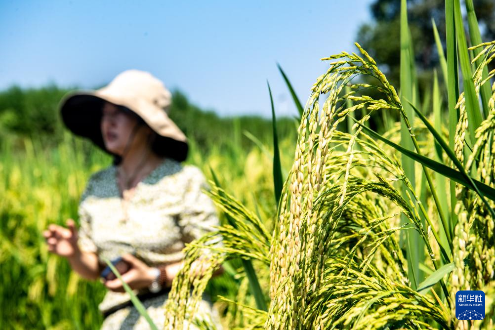 9月7日,当地工作人员在向游客介绍水稻种植情况。