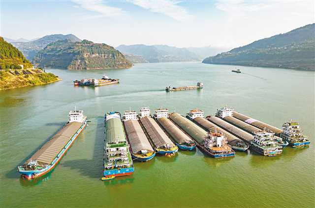 近日,万州区大周镇长江边上,等待卸货的船舶停靠在港湾里。