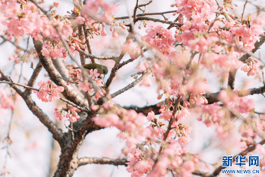 冬樱花盛开吸引小鸟驻足。新华网 耿骏宇 摄
