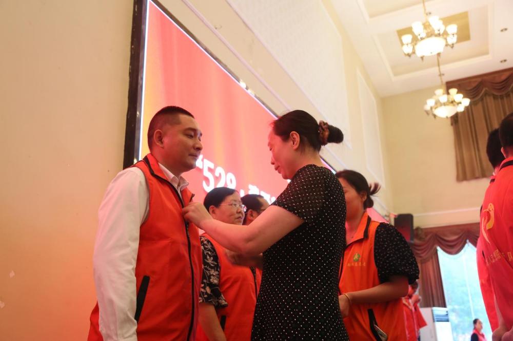 刘玉霞(前左二)为志愿者佩戴队徽。受访者供图