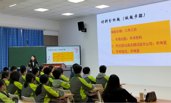 随后,在初三历史教学经验与计划交流会上,两江中学黄荣老师分享了初三历史复习策略,从“教、学、评”三个方面指导分析今年中考题命题趋势与解题方法,并提出今年历史中考复习在基于单元复习的基础上注意关注时事热点,将热点与现实联系。