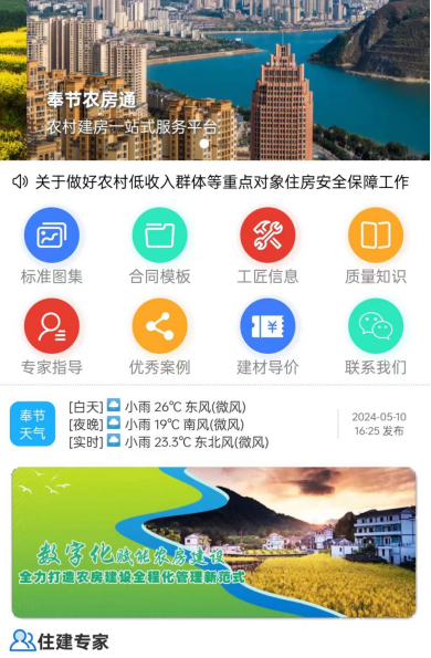 以方便农户为出发点,奉节县住房城乡建委在全市首创“奉节农房通”农村建房一站式服务平台,集合现场视频监控、预警信息发布等7个功能版块,供农户在线自助选图、选工匠、签合同、比价格、咨询答疑,累计为178户农户提供不出家门即可自助选图、咨询答疑等服务541件次。