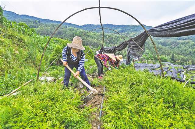 5月30日,开州区温泉镇乐园村雪宝山国家级自然保护区崖柏繁育科研基地,村民正在苗圃里挑选两年生和三年生崖柏扦插苗。记者 郑宇 谢智强 摄/视觉重庆