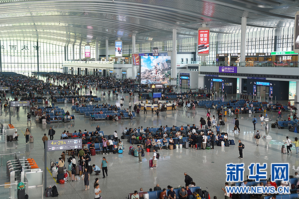 重庆西站候车室内出行旅客较日常明显增加。新华网发(魏伟 摄)