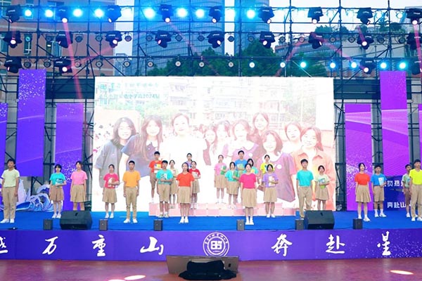 学校全体校领导同唱一首歌《祝你一路顺风》,表达了对学子们的美好祝福。