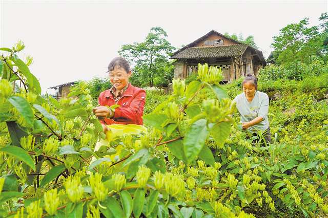 6月22日,武隆区凤山街道广坪村金银花基地,村民正忙着采摘金银花。近年来,武隆区凤山街道在巩固脱贫攻坚成果中,围绕市场调整产业结构,引导广坪村、杨家村的村民利用边角地和撂荒地种植金银花1000余亩,既有效盘活了土地,保护了生态,又增加了农民收入。(通讯员 陈庆发 摄/视觉重庆)
