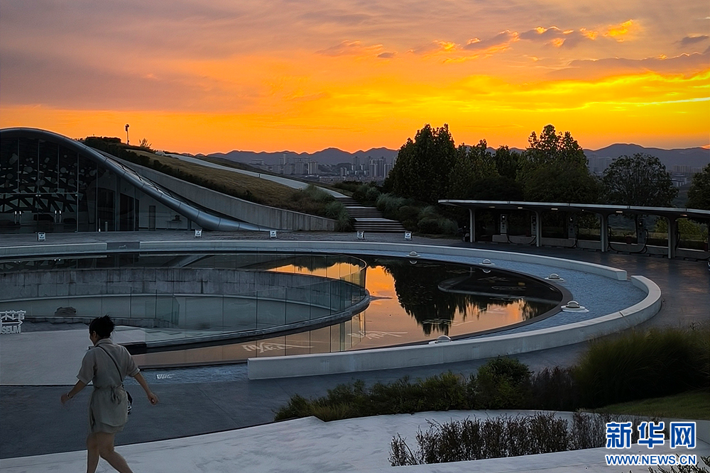 站在美术馆的露台之上,城市轮廓在夕阳勾勒下变得柔和,远山和落日成为了最动人的背景。新华网发(夏敏 摄)