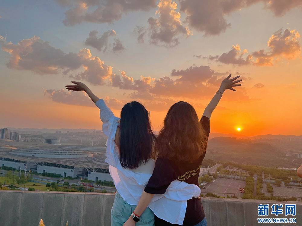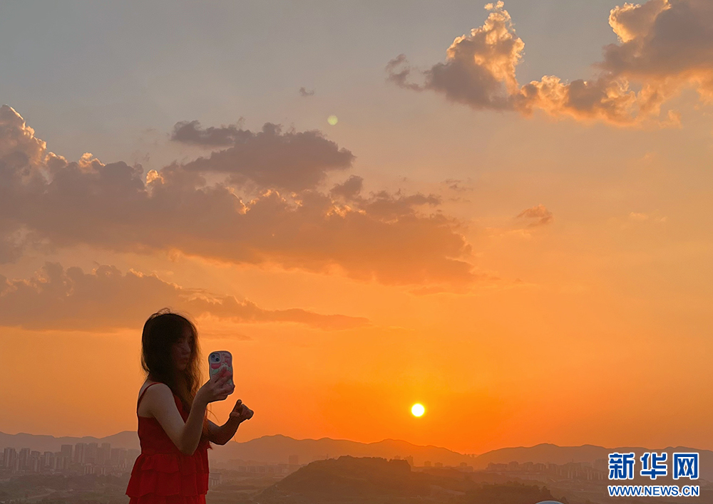 一眼望去,远处的城市和群山渐渐沉入夕阳的怀抱。新华网 韩梦霖 摄