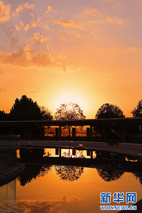 阳光倾洒在悦来美术馆入口的浅浅水池上,渲染出浪漫的橘色。新华网发(夏敏 摄)