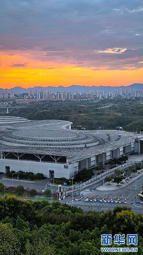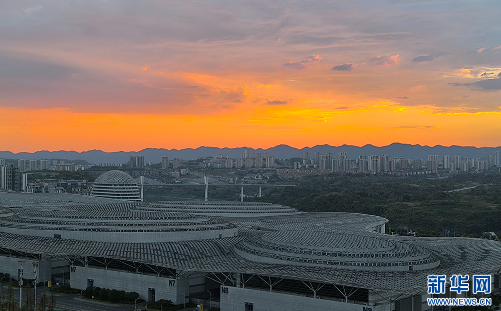 重庆国博中心巨大的建筑轮廓,在绚烂的夕阳余晖中更显雄伟。新华网 韩梦霖 摄