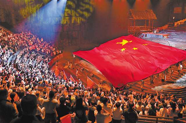 10月3日,沙坪坝区重庆1949大剧院,观众正在观看以红岩文化为创作背景的大型红色历史舞台剧《重庆·1949》。国庆假期,在红岩精神发源地的重庆,很多游客和市民通过观看该剧来铭记历史、汲取力量。特约摄影 孙凯芳/视觉重庆
