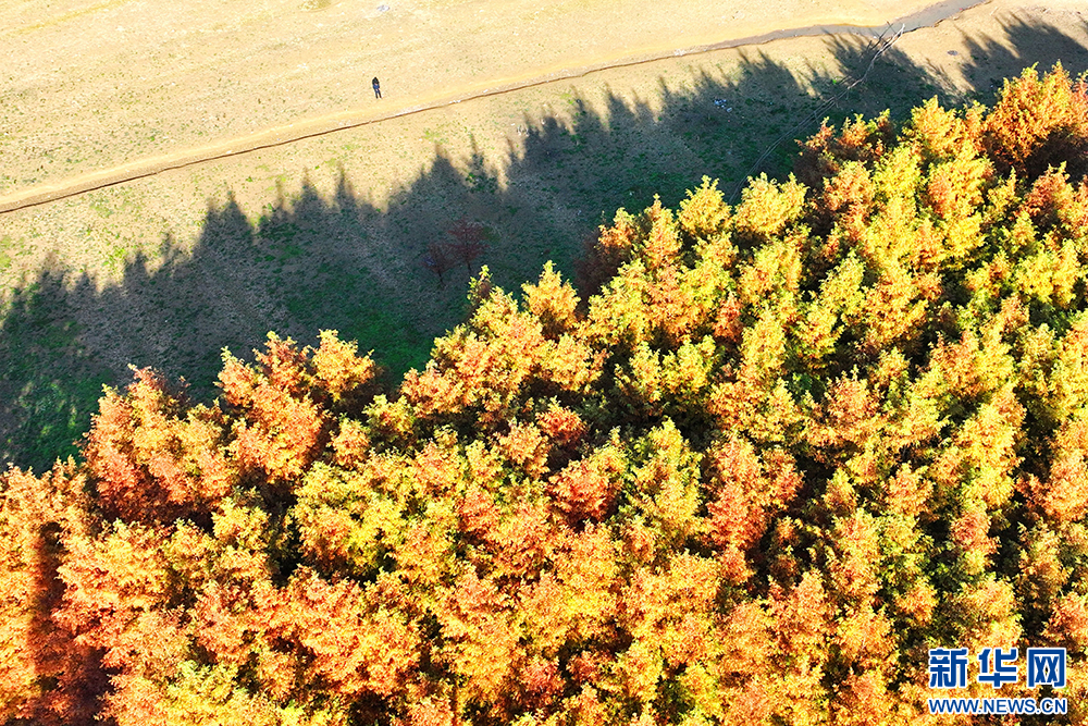 冬日暖阳下,高大细密的水杉层林尽染,成为一道美丽而静谧的风景。新华网发(陈碧生 摄)