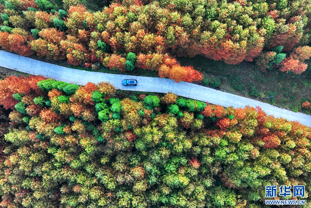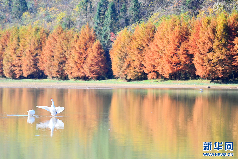 初冬时节,重庆市酉阳土家族苗族自治县桃花源街道天山堡村韦家槽水库周边,大片的树木层林尽染、五彩斑斓,与湛蓝的天空和清澈的湖水相互映衬,呈现出如诗如画的冬日美景。新华网发(陈碧生 摄)