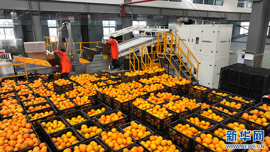 果农们正在分拣机前分拣、转运脐橙。 新华网发(胡程 摄)