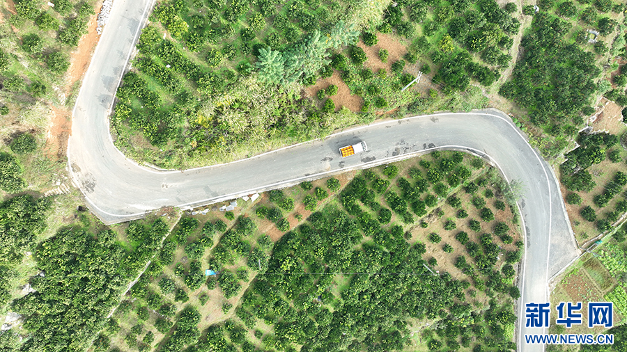 一辆载满脐橙的小车行驶在脐橙园里。新华网发(胡程 摄)