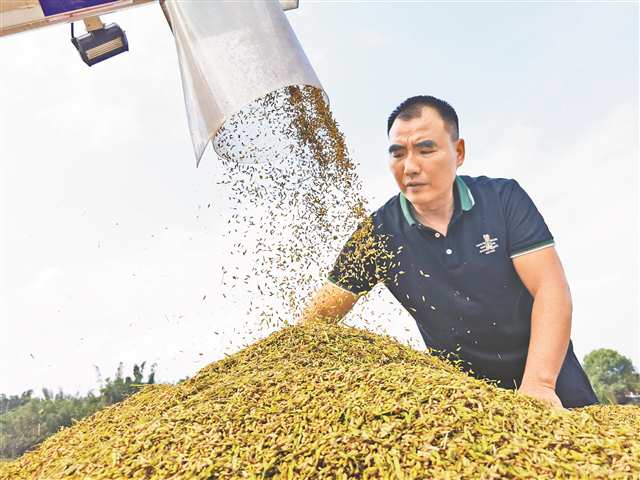 10月28日,永川区朱沱镇马道子村种粮大户罗勇在查看刚收获的水稻。