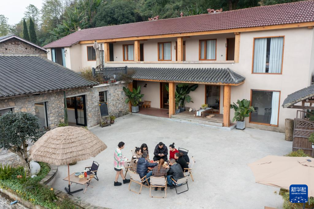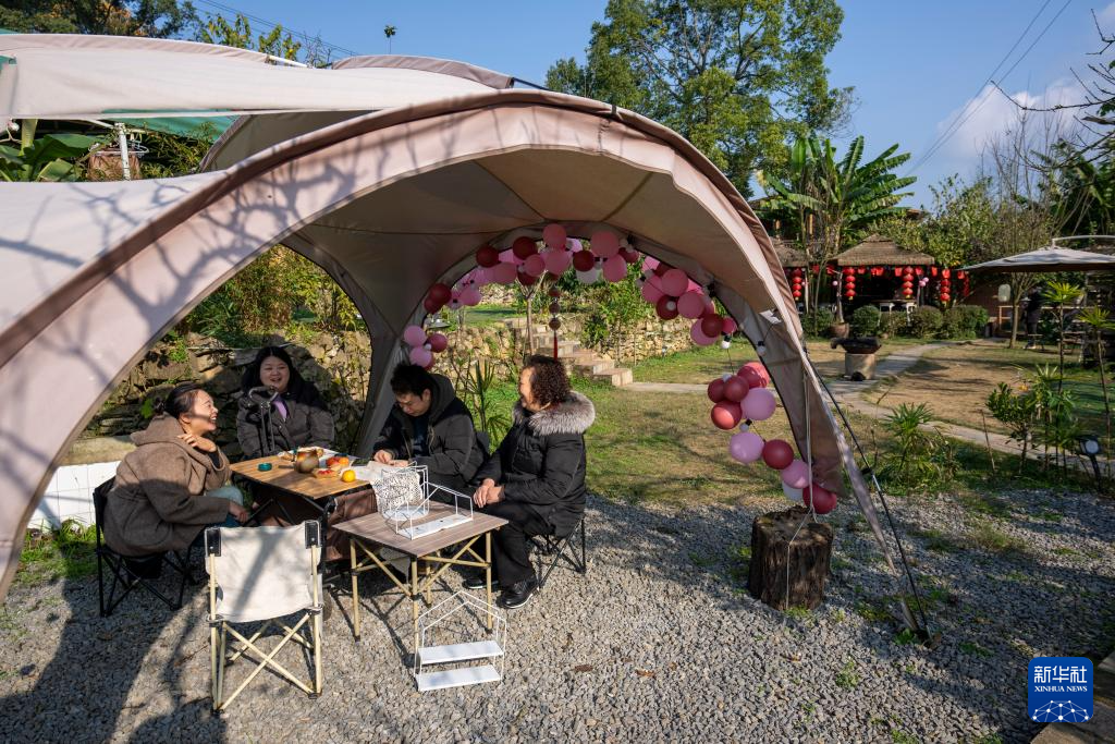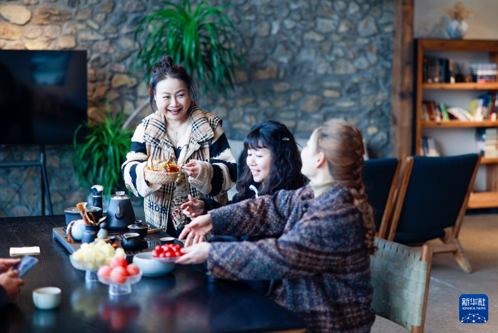 12月11日,重庆市北碚区天府镇工农村吾居无束民宿,返乡创业的民宿经营者龙正莉(左一)为游客服务。新华社记者 刘潺 摄