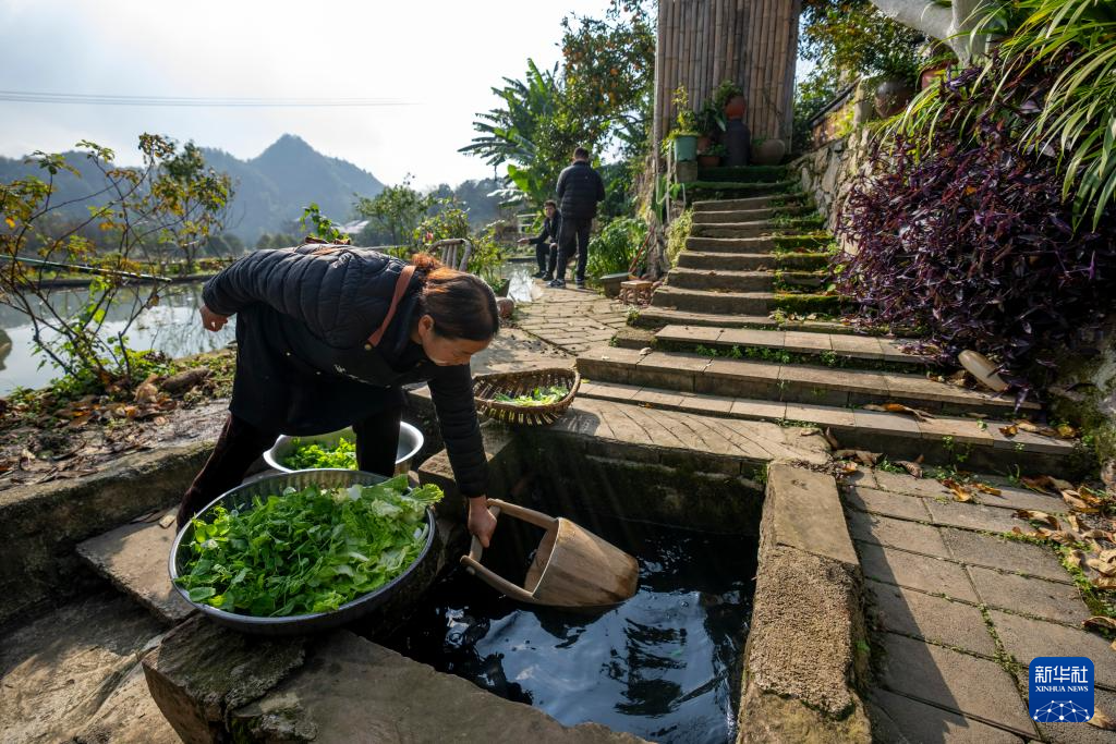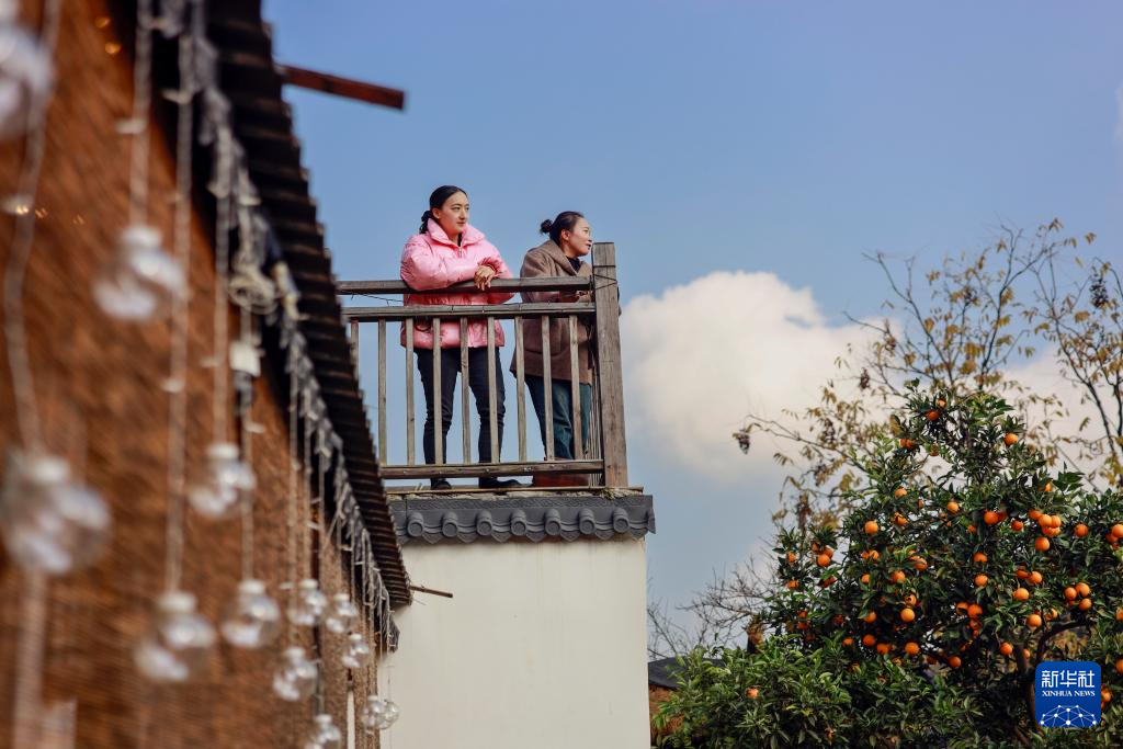 12月11日,重庆市北碚区天府镇文星村的弄泉斋民宿,民宿经营者叶星(右一)为游客服务。新华社记者 刘潺 摄