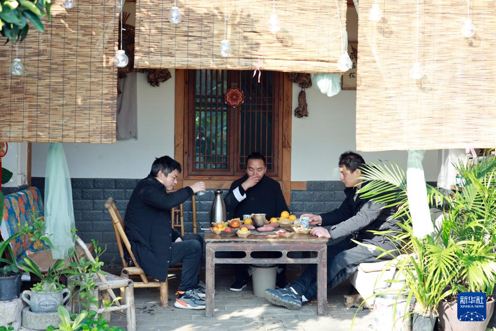 12月11日,重庆市北碚区天府镇文星村的弄泉斋民宿内,游客休闲品茗。新华社记者 刘潺 摄