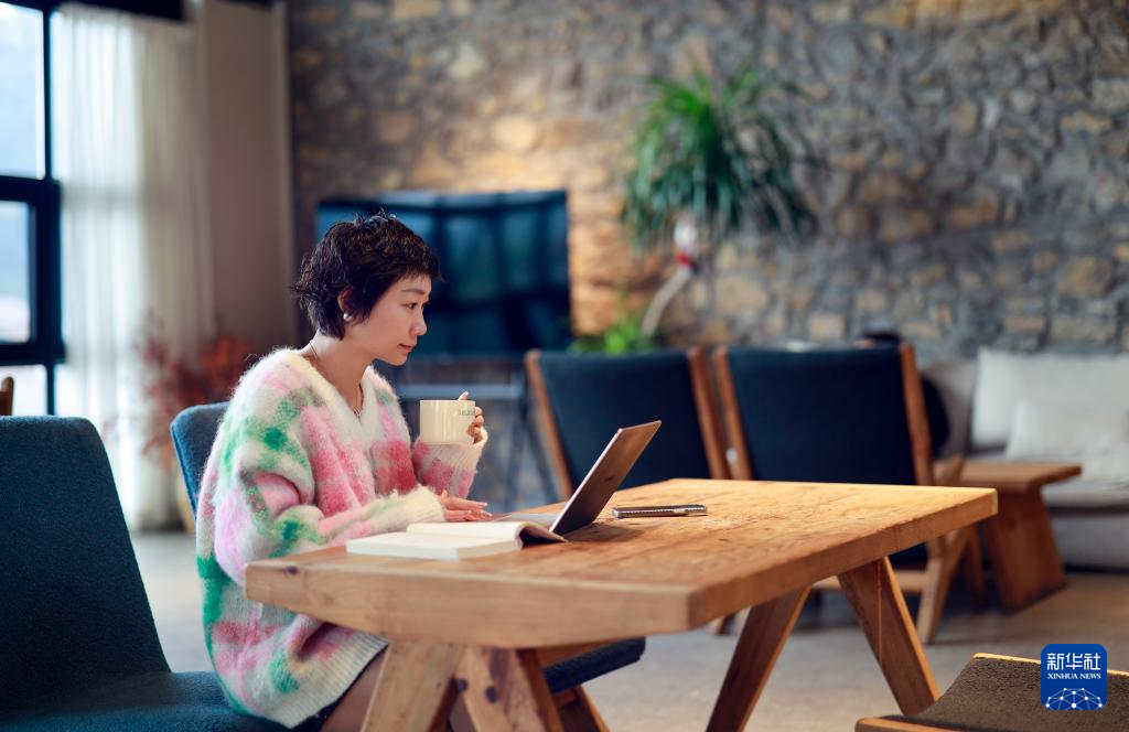 12月11日,重庆市北碚区天府镇工农村吾居无束民宿的咖啡厅内,民宿的主理人龙凤通过网络与预定的游客沟通交流。新华社记者 刘潺 摄