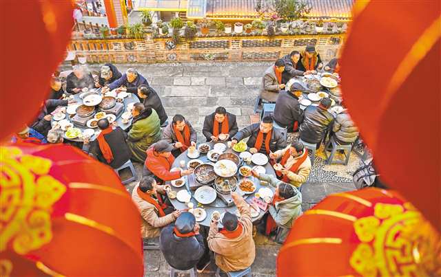 1月13日,石柱县桥头镇陶然居瓦屋小镇张灯结彩,村民们欢聚一堂,共享热闹温暖的团年饭。记者 齐岚森 摄/视觉重庆