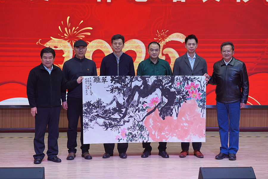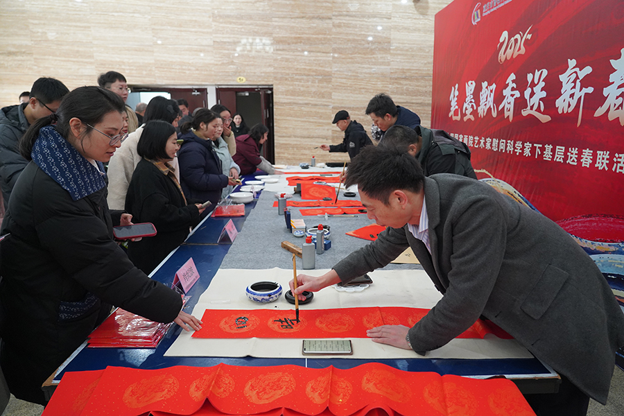 1月20日,来自中国国家画院、河南省越调剧团、周口市豫剧团的艺术家走进重庆市畜牧科学院、国家生猪技术创新中心,通过送春联、送书画、慰问演出等形式,把新春文化“大餐”送到科技工作者家门口。“艺术与科学的互渐互动,激发全院干部职工新一年干事创业热情,推动畜牧科技事业再上新台阶。”重庆市畜牧科学院、国家生猪技术创新中心党委书记唐德荣表示。