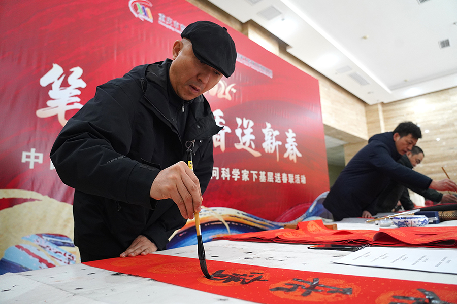 在重庆市畜牧科学院,中国国家画院的艺术家为科技工作者送上新春对联。邵以南 摄
