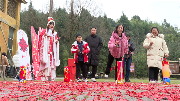 大红灯笼高高挂,张灯结彩迎新年。春节期间,位于北碚区的金刀峡景区推出了丰富多彩的迎新春活动,游客们在欣赏峡谷美景之余,还可以参与投壶、打糍粑、拓印等非遗活动,体验浓厚的节日氛围和独特的文化魅力。