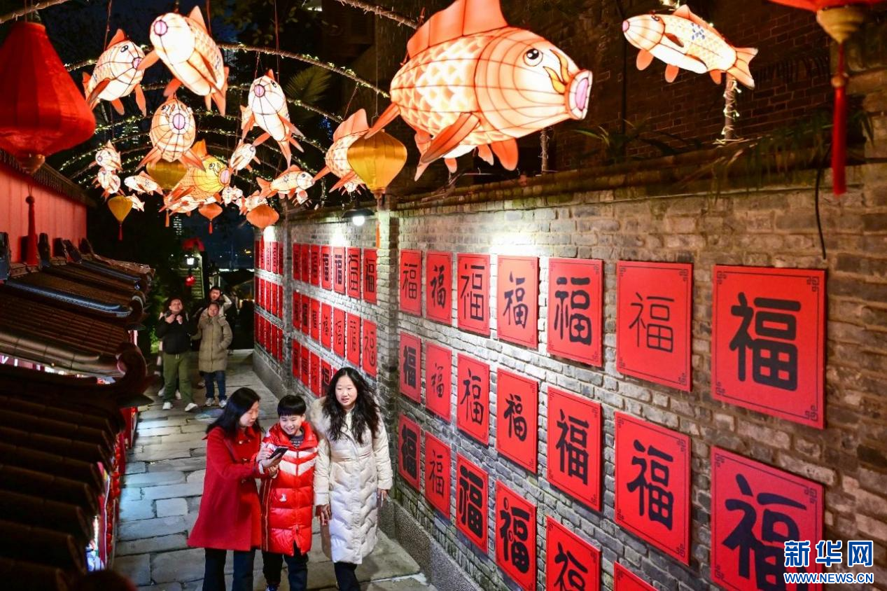 红灯笼、鲤鱼灯和“福”字将龙门浩老街装点得分外喜庆,处处洋溢着浓郁的年味,一幅生动的新春画卷在这里徐徐展开。新华网发(郭旭 摄)