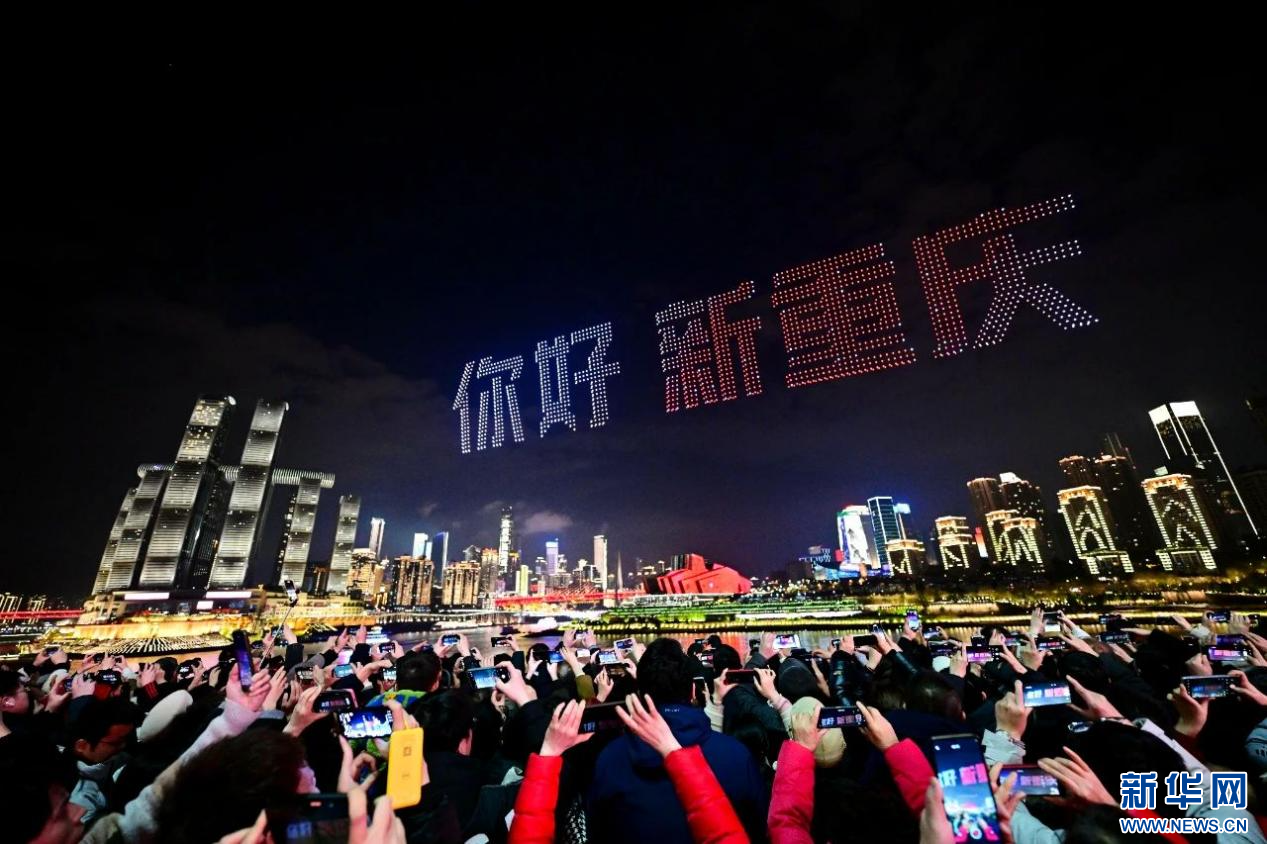 春节期间,南滨路上的迎新春无人机表演璀璨登场,绚丽多彩的空中图案吸引大批市民游客前往打卡留念。新华网发(郭旭 摄)