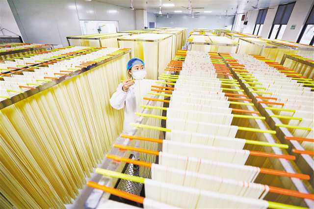 3月12日,位于梁平高新区的重庆都粮农业科技有限公司,工人在查看挂面的风干情况。这批挂面即将销往国外。