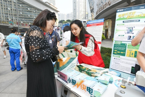 在江北区观音桥商圈活动现场,“小易快电”网格经理向来往市民普及电力计量、安全用电、科学用电等知识,倡导数字化、信息化、便捷化的生活方式,手把手指导客户熟悉线上软件功能,对客户提出的问题进行耐心解答。