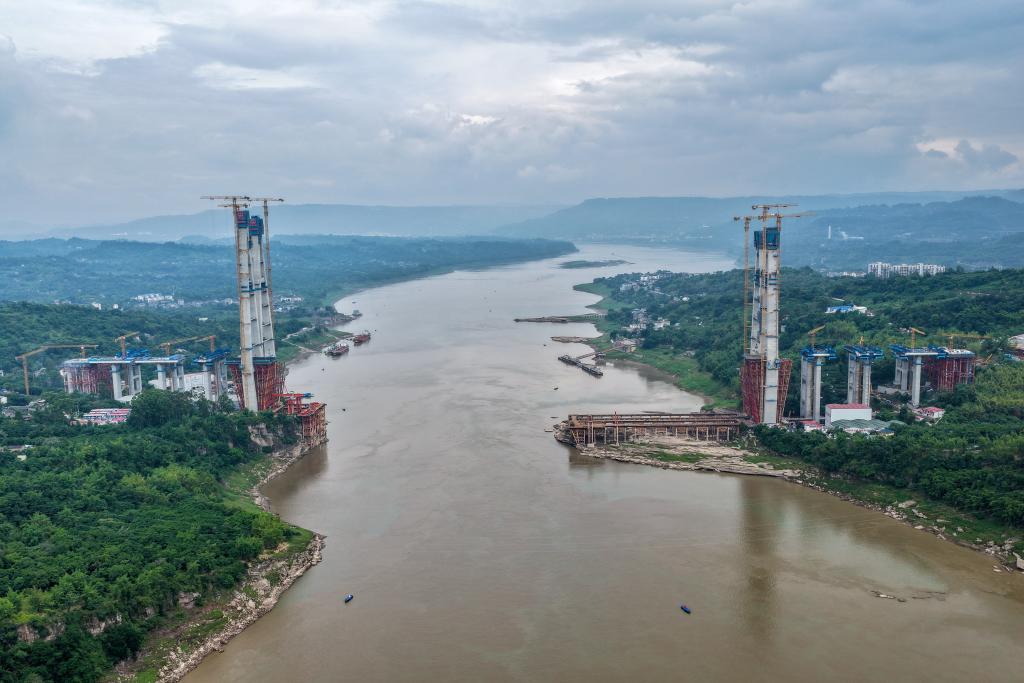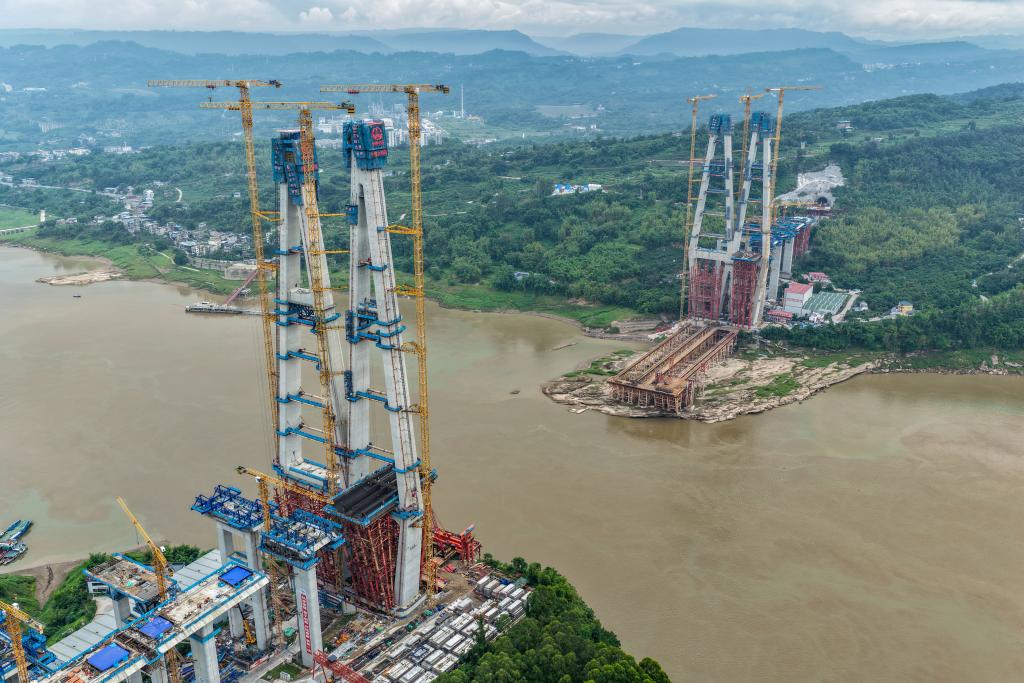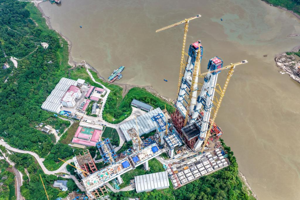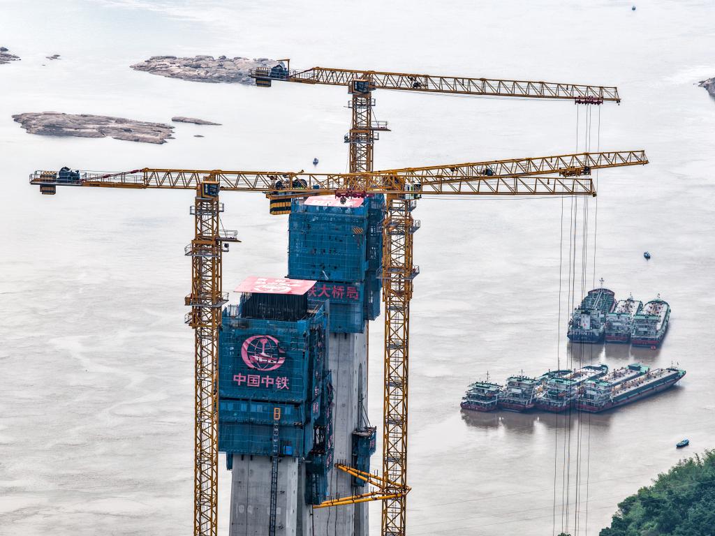 石沱长江大桥位于重庆市涪陵区,是渝万高铁全线控制性工程,主桥全长1056米,主跨608米,北岸5号主塔高234.9米,南岸6号主塔高253米。