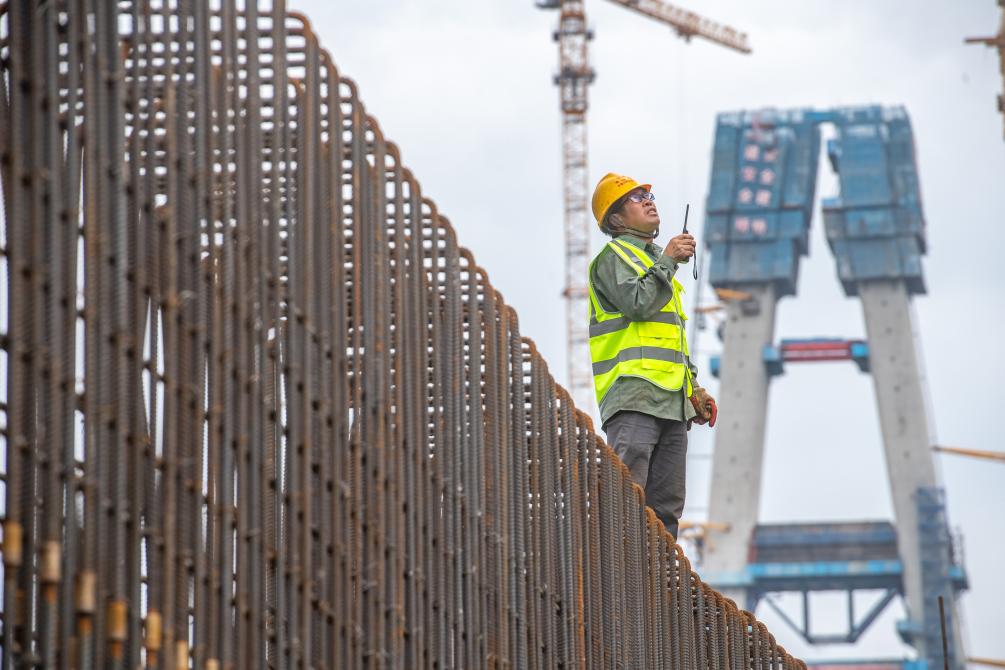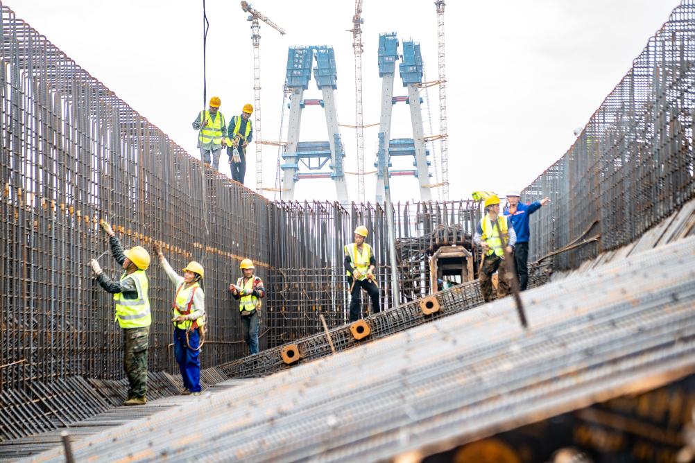 5月28日,工人在渝万高铁石沱长江大桥建设现场施工作业。