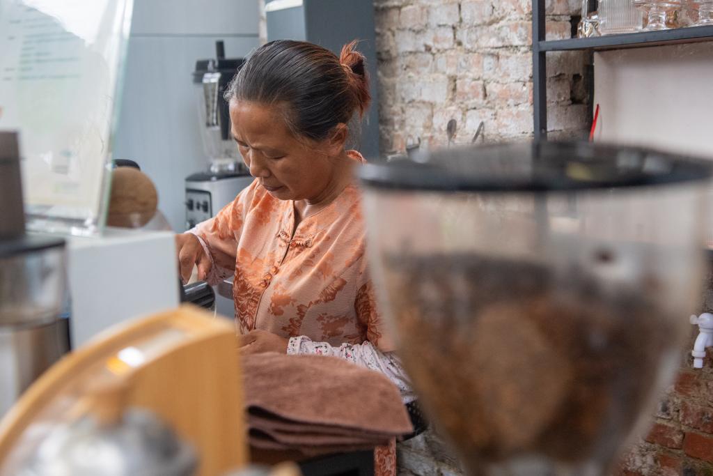 8月15日,在竹山镇猎神村一处用矿山用房改造的咖啡馆内,工作人员在制作咖啡。