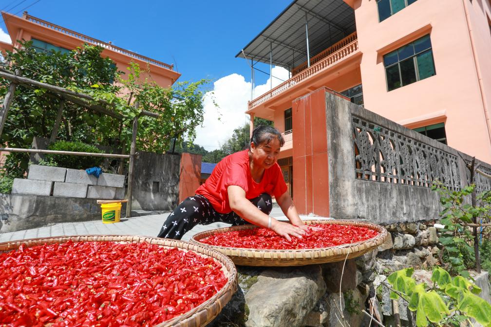 近日,重庆市秀山县洪安镇猛董村村民抢抓晴好天气,在房前屋后忙着晾晒玉米、水稻、辣椒等农作物。