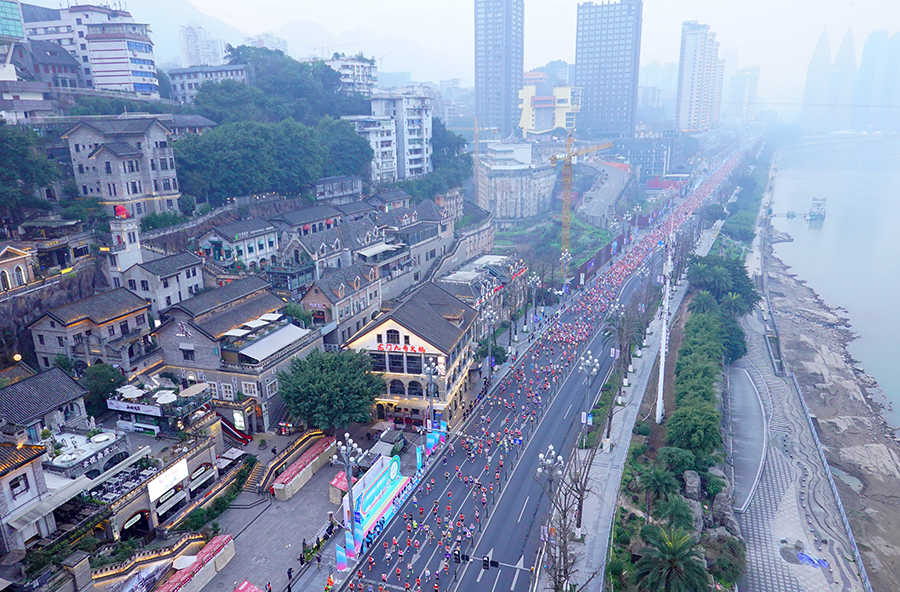 2025重庆马拉松上,选手在南滨路上奔跑。新华社记者 刘潺 摄