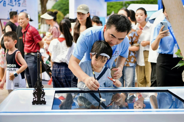 舞台下,江北区鲤鱼池小学的主题成果展人气高涨,同学们握笔泼墨,现场展示书法,AI智能书法桌前也吸引众多市民游客体验打卡。鲤鱼池小学副校长龚飞介绍,鲤鱼池小学自建校起便将书法作为学校特色发展,将其设为校本课程,配备专职教师与专用场地,每周安排固定课时教学,并通过社团活动强化训练,学生对书法兴趣高,学校书法氛围浓厚。