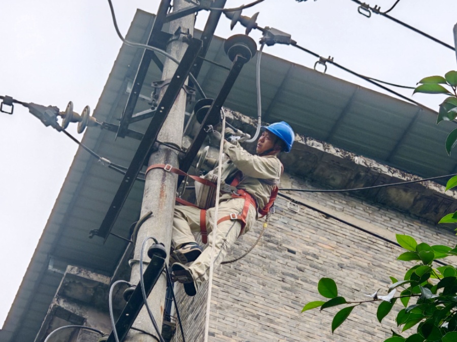 国网重庆綦江供电公司带电作业班在綦江区交通路10千伏城中线消除线夹发热隐患。(袁巧 摄)