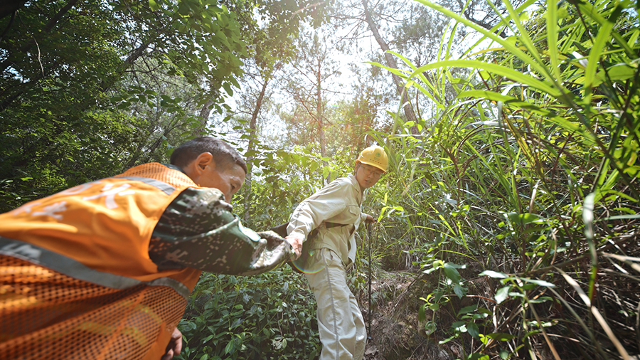 国网重庆綦江供电公司输变电运检中心员工联合区林业局在隆盛镇开展跨林区输电线路隐患排查。(蹇金花 摄)