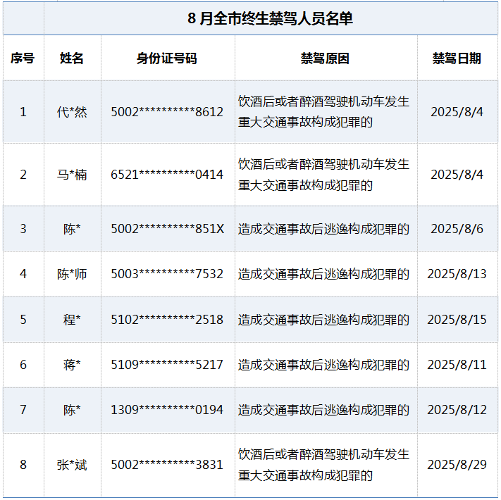 为持续提升全民交通安全意识、文明意识、法治意识,有效预防和减少道路交通事故,营造平安畅通的道路交通环境,9月24日,重庆市公安局交通管理局向社会曝光2025年8月全市终生禁驾人员名单。
