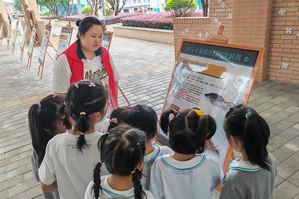 校园里,36块图文展板、15个水族箱活鱼展示更吸引着同学们参观停留。他们围成一圈,指着水中游动的鱼儿兴奋地观察讨论着。“这是国家一级保护动物,不能捕捞!”“草鱼和鲈鱼我吃过,但没想到还有这么多漂亮的品种!”三年级11班的董严鸽同学被中华沙鳅迷住了:“它身上的斑纹太美了!”另一名同学说,此次活动体验让她近距离了解了长江鱼类,感受到水生生物的魅力,也启发着自己用实际行动关爱水生动物,保护美丽家园。