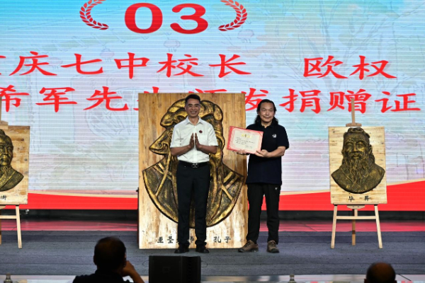 近日,重庆市第七中学校(重庆大学附属中学校)在校内东川大讲堂举办了一场别开生面的雕像捐赠仪式。此次仪式旨在弘扬中华优秀传统文化,尊崇传承先贤思想智慧,营造校园浓厚人文气息与尊师重教氛围;激励广大师生见贤思齐,汲取传统文化精髓,砥砺品行,修身治学,进一步推动校园文化建设和立德树人。