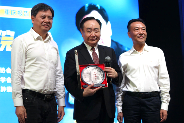 报告会尾声,重庆八中学生代表与周迎春共同向樊代明院士赠送了精心准备的礼物,以此表达全校师生对院士的敬意与感谢。